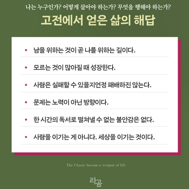 그는 고전 속 인물들의 경험과 교훈을 통해 자신이 살아가야 할 방향성을 찾고 목표를 재정립할 수 있었다고 한다.
